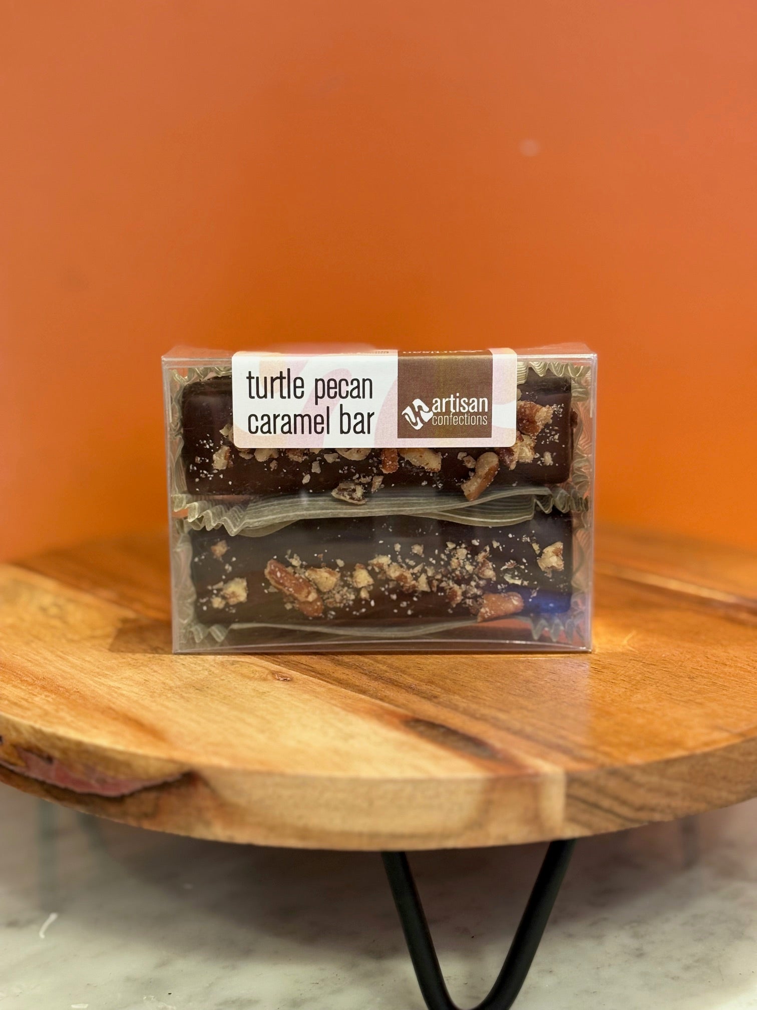 A rich turtle-style bar featuring velvety caramel, toasted pecans, and covered in a 55% dark chocolate. Each bite blends buttery sweetness with a warm nutty crunch for a classic, indulgent treat.