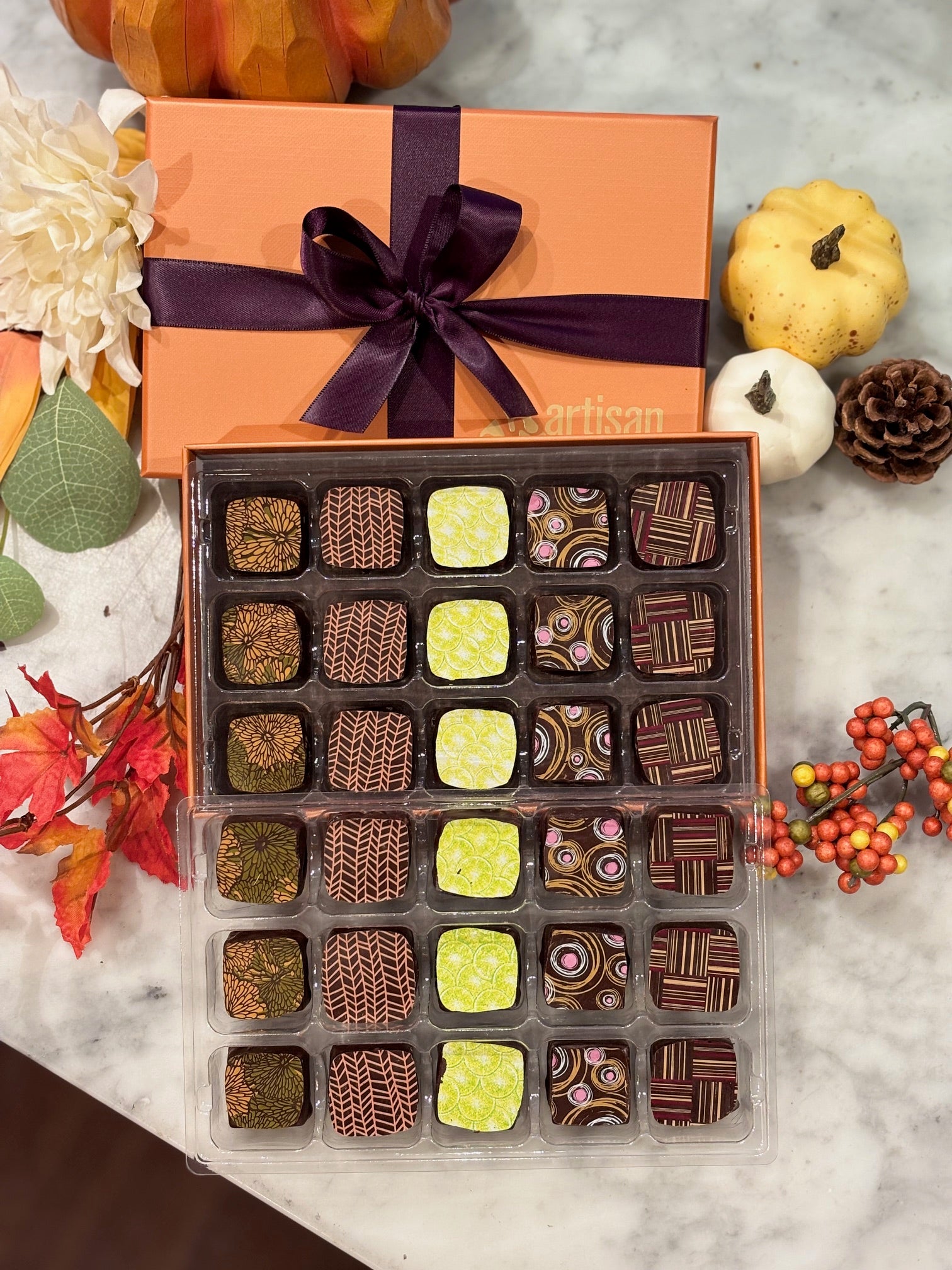 Pumpkin Pie: A double-layer truffle with dark chocolate ganache infused with pumpkin puree, and flavored with classic pumpkin spice, and a graham cracker crust.