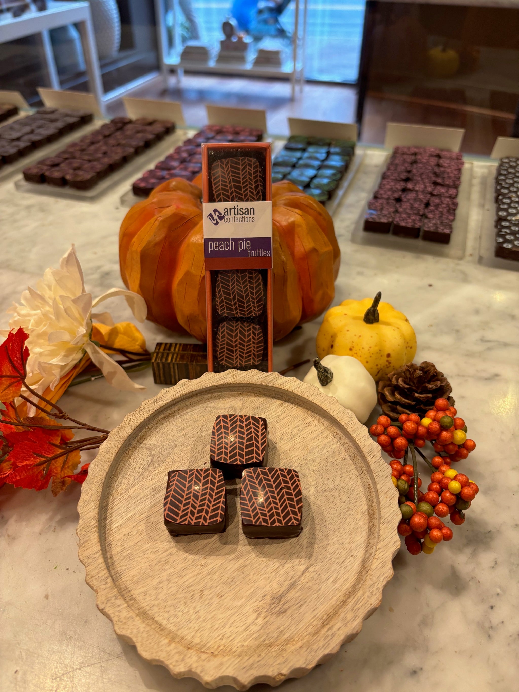 Enjoy 5 pieces of peach pie truffles, a triple - layer truffle with a peach pate de fruit, a creamy milk chocolate ganache , and a graham cracker crust.