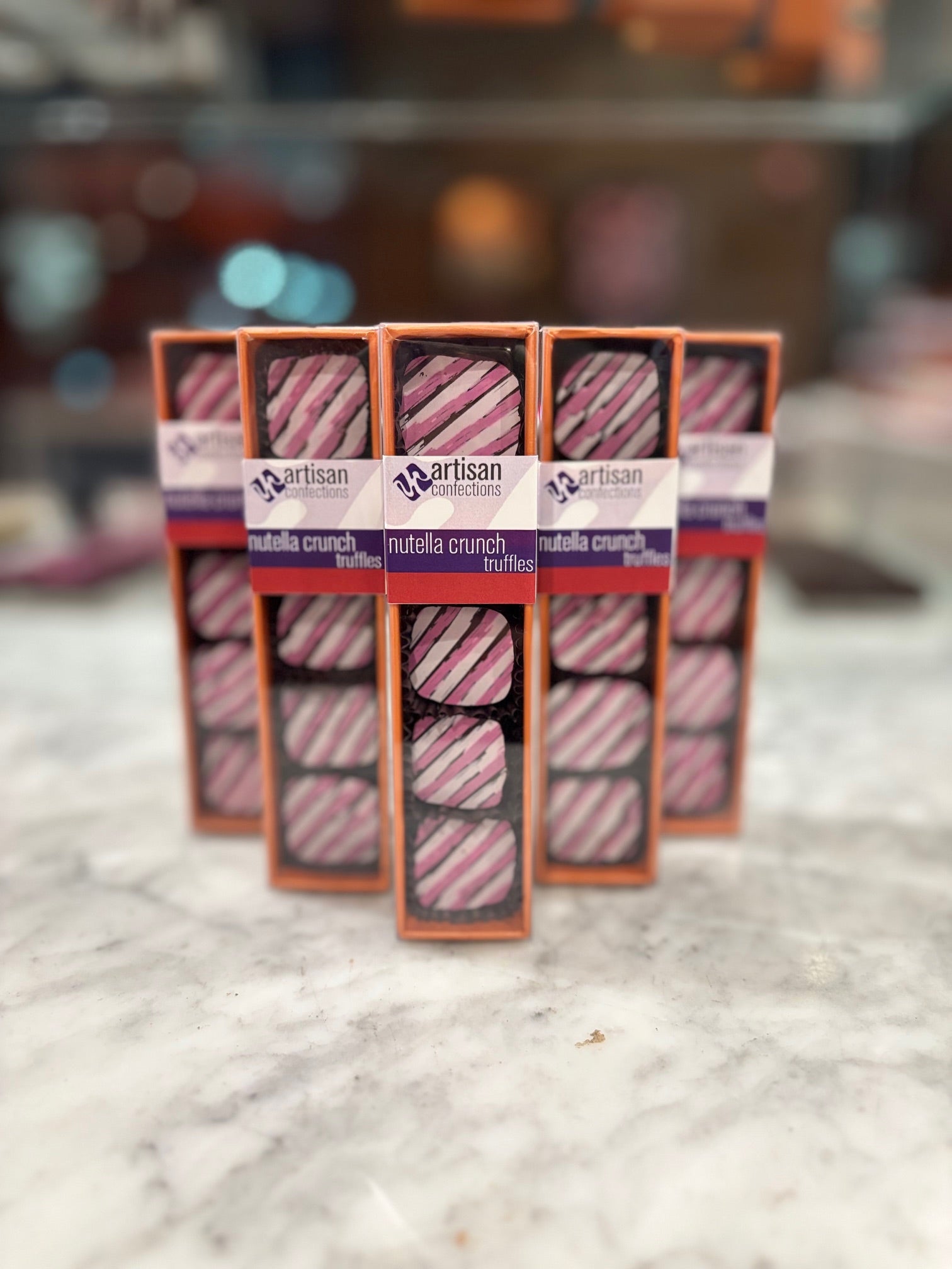 Our 5-piece pack of truffles Nutella crunch a milk and Nutella chocolate ganache with a feuilletine crunch and enrobed in dark chocolate . This classic favorite is perfect for anyone on your Valentines Day gift list.